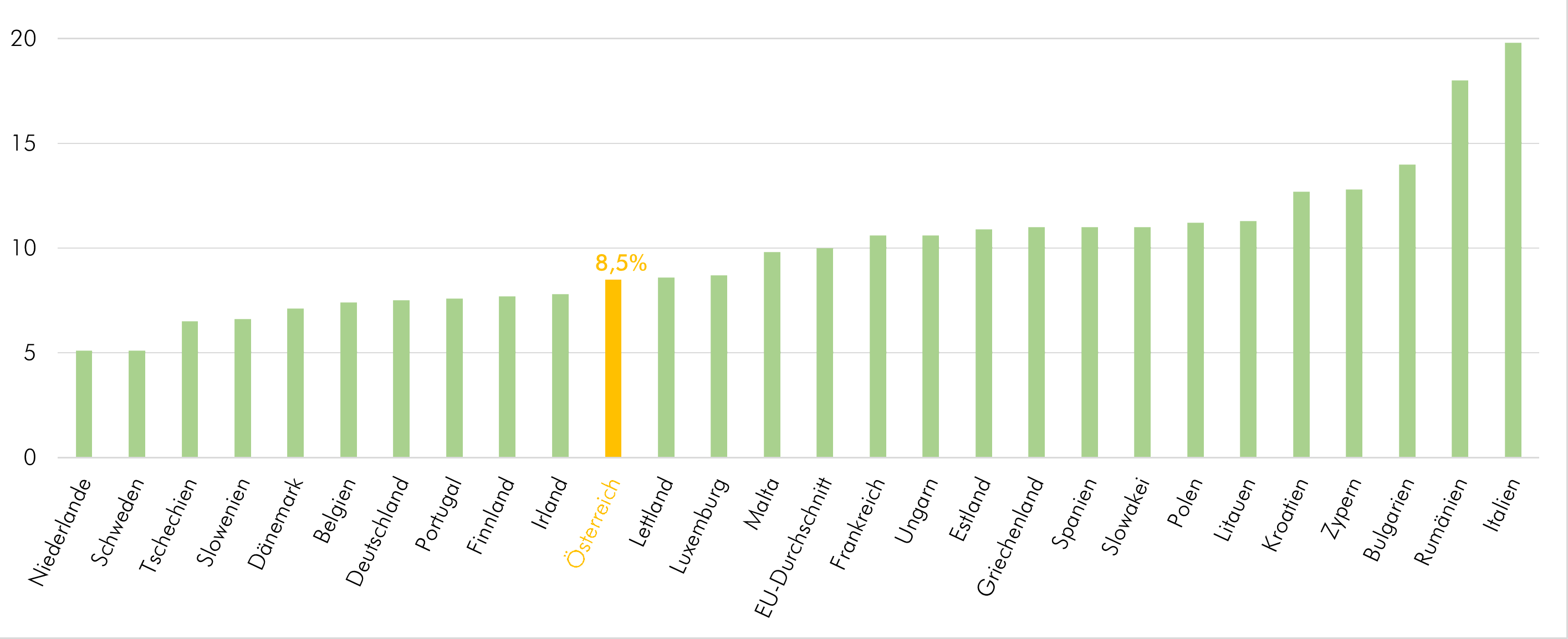 Im europäischen Vergleich liegt Österreich mit diesem Wert noch unter dem EU-Durchschnitt und im besseren Mittelfeld, wie die folgende Grafik zeigt.