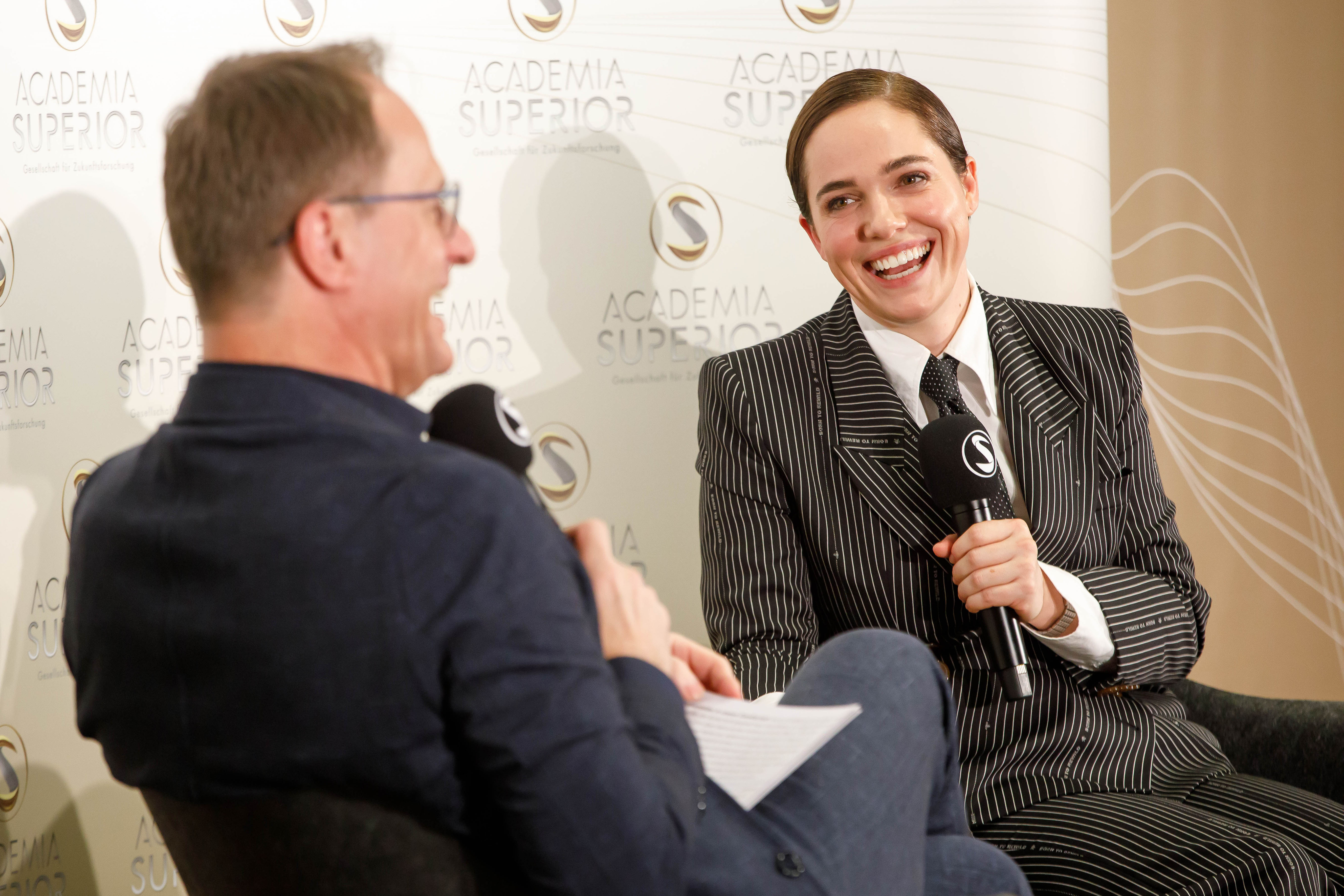 Chris­tine Haber­lan­der, Obfrau von Acad­e­mia Supe­ri­or, betonte in ihrer Begrüßung: „Ver­e­na Altenberg­er ist eine Schaus­pielerin mit ein­er klaren Werte­hal­tung, die sie auch zum Aus­druck bringt und für die sie sich aktiv ein­set­zt. Sie zeigt, dass Kun­st eine kraftvolle Plat­tform für Verän­derung ist.“