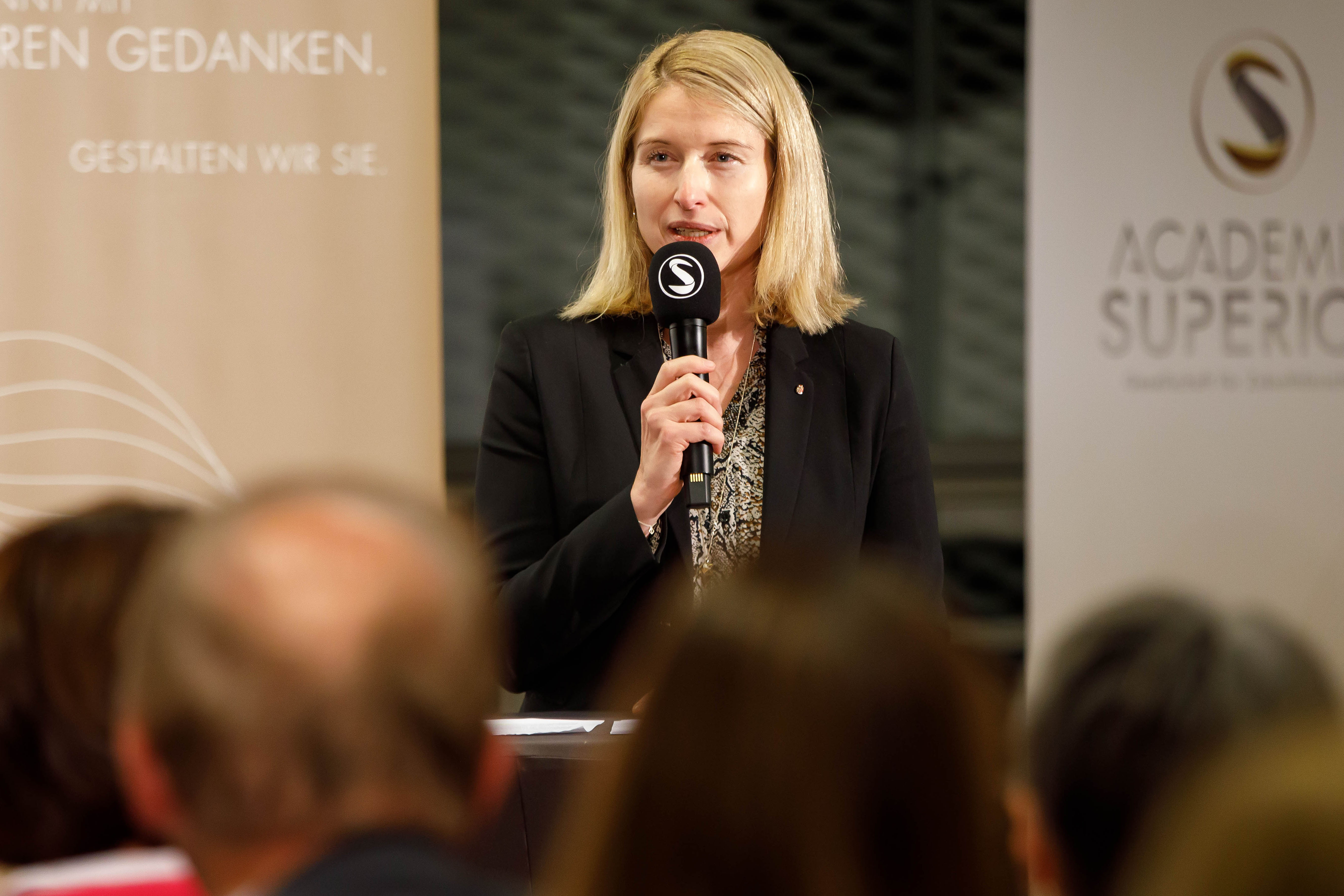 Foto 3: Chris­tine Haber­lan­der begrüßt zum 22. Dia­log der Acad­e­mia Superior
