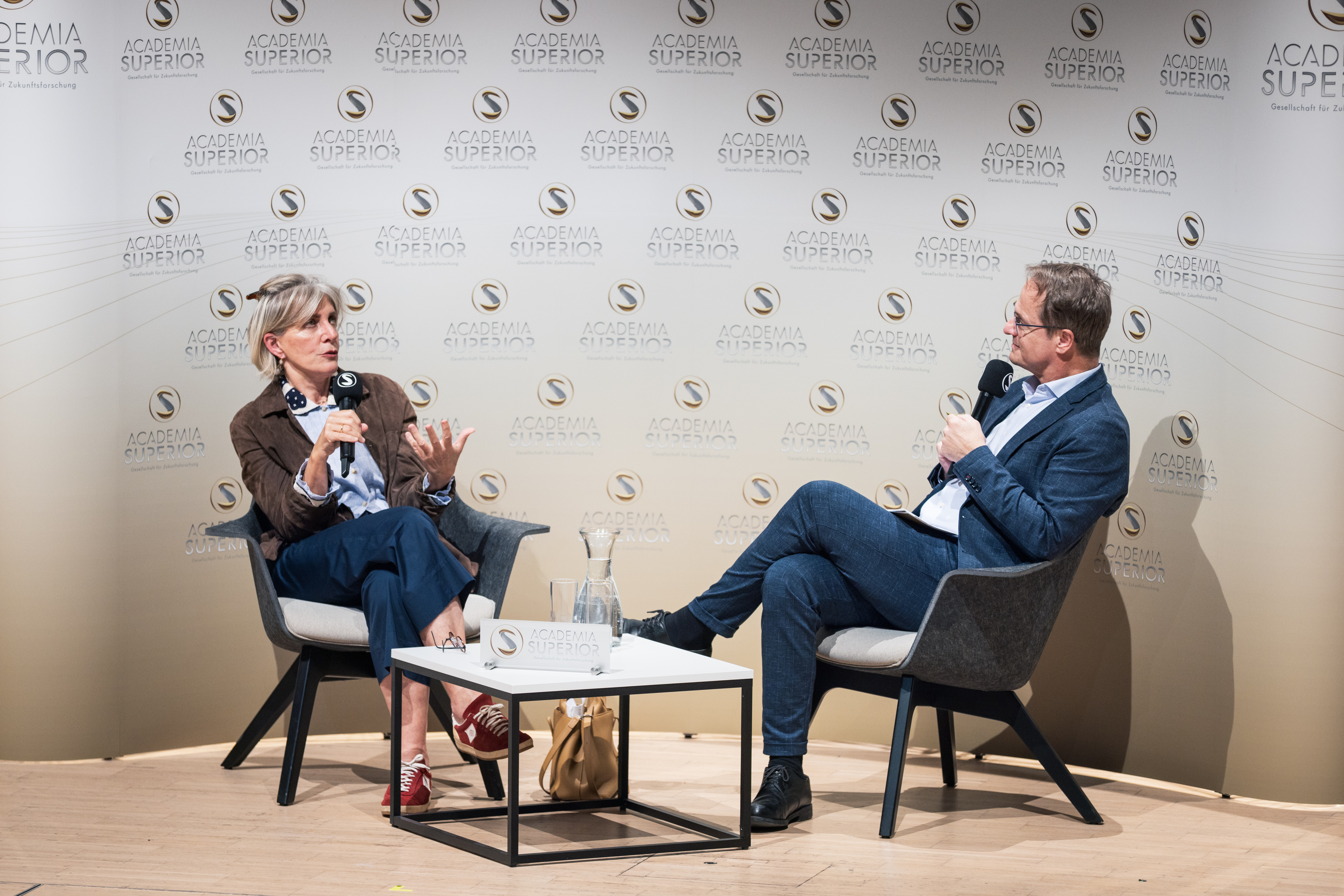 Im Gespräch mit Univ.-Prof. Dr. Markus Hengstschläger erzählte die Malerin Xenia Hausner, wie sie den Schritt von der Bühnenbildnerin zur Malerin wagte. Kunst sei für sie ein Zusammenspiel aus Einfall und Zufall: „Der Zufall ist nicht zu unterschätzen und mindestens so wichtig wie der Einfall.“ Ihre Werke, geprägt von Ambivalenz und Mehrdeutigkeit, wollen keine eindeutigen Antworten geben. „Die Botschaft meiner Bilder ist mehrdeutig – das Leben ist kein Schwarz-Weiß“, sagte Hausner.