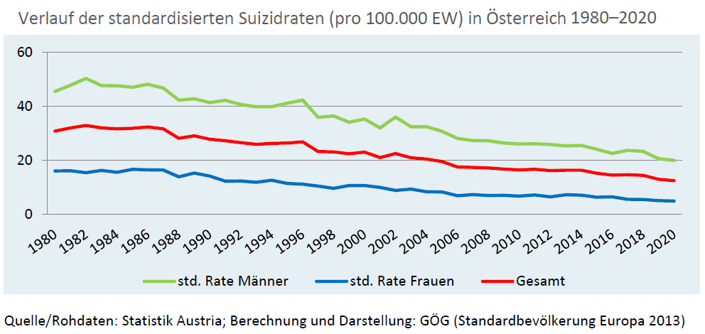 Noch geringer als 2021 war diese Zahl mit 1.072 Suiziden im Jahr 2020. Aber: während die Suizide bei Frauen weiterhin rückläufig ist, ist sie bei Männern zuletzt wieder gestiegen. Hinzu kommt: noch immer werden drei Viertel der Suizide in Österreich von Männern begangen. Auch der relative Rückgang der Suizide war bei Frauen in den vergangenen Jahrzehnten deutlich höher als bei Männern.