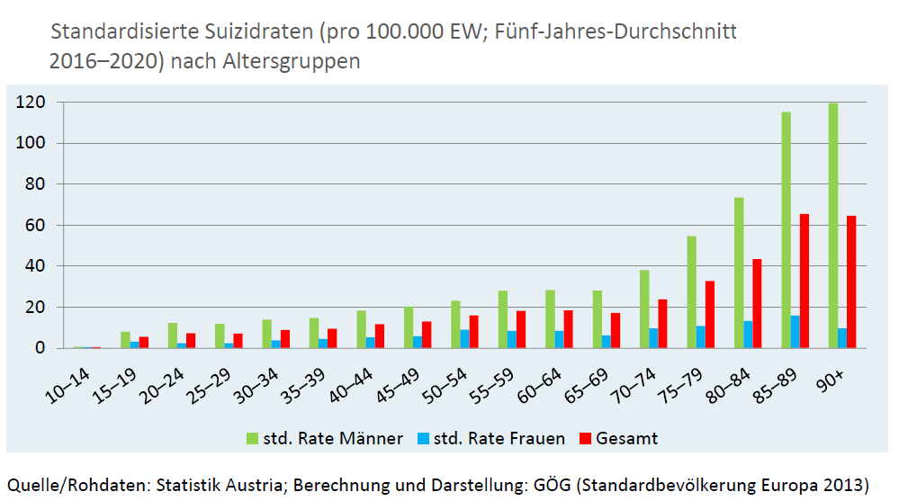 - Die Suizidrate steigt in Österreich mit dem Alter an. Das Suizidrisiko ist in der Altersgruppe der 75- bis 79-Jährigen fast zweieinhalbmal, in der Altersgruppe der 85- bis 89-Jährigen über viereinhalbmal so hoch wie jenes der Durchschnittsbevölkerung. In absoluten Zahlen sind die meisten Suizide im mittleren Lebensalter zu verzeichnen: rund 36 % aller Suizide finden in der Altersgruppe 45–64 Jahre statt. Der Häufigkeitsgipfel in absoluten Zahlen liegt im Alter zwischen 50–59 Jahre. Relativ betrachtet, liegen die höchsten Suizidraten jedoch in den älteren Altersgruppen.(4)