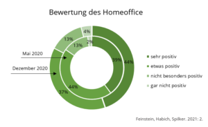 Im Halbjahresvergleich erkennt man, dass es kaum eine Veränderung hinsichtlich der Bewertung des Homeoffice der Arbeitnehmer*innen gibt. Im Mai 2020 bewerteten 83% das Homeoffice als positiv. Im Dezember blieb dies mit 81% praktisch gleich. Vor allem die Annehmlichkeiten wie keinen Arbeitsweg zu haben, produktiver zu sein und auch Kosten zu sparen sind für viele ausschlaggebende Argumente. Durchschnittlich benötigt ein*e Österreicher*in täglich 60 Minuten für den Arbeitsweg. Diese Zeit gewinnt man natürlich wieder im Homeoffice und spart gesamt nicht nur Zeit, sondern auch Geld.