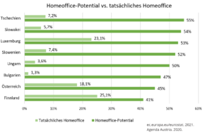 Auffällig ist hierbei, dass das Homeoffice Potential im Osten Europas am größten ist. Es herrscht dort eine erhebliche Diskrepanz zwischen dem möglichen und tatsächlichen Homeoffice. In jenen Staaten, in denen viele Erwerbstätige von Zuhause aus arbeiten, ist hingegen das Potential nicht überdurchschnittlich hoch.