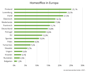 Vor Österreich landeten Finnland, wo über ein Viertel der Arbeiter*innen von zu Hause aus arbeiteten sowie die Länder Luxemburg (23,1%) und Irland (21,5). Der EU-Durchschnitt beläuft sich auf 12,3%. In Teilen Osteuropas sind die Homeoffice-Raten weitaus niedriger und in Bulgarien und Rumänien mit nur 1,2 bzw. 2,5 Prozent praktisch nicht vorhanden.