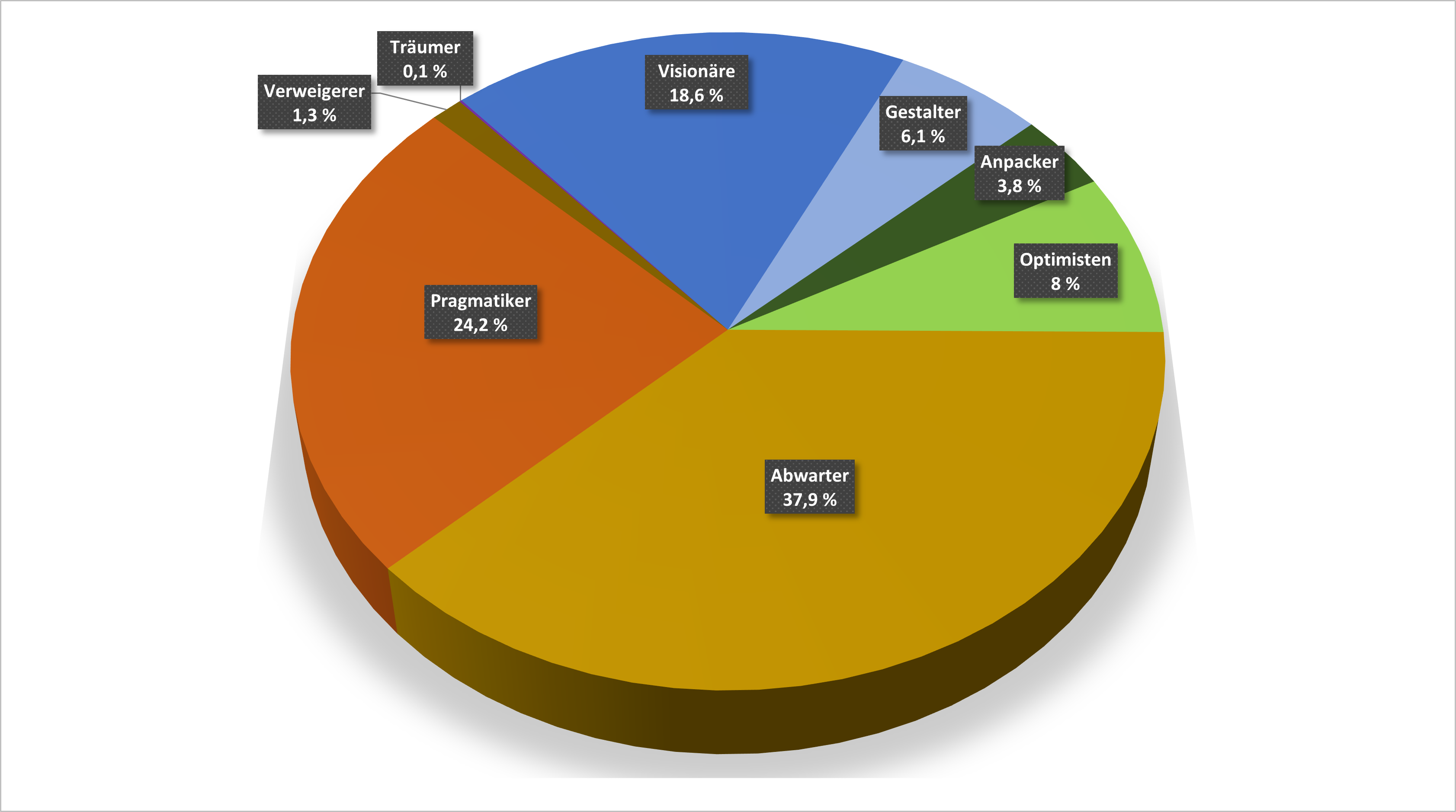In diese Gruppe fallen die 18,6 Prozent „Visionäre“, 6,1 Prozent „Gestalter“ und 3,8 Prozent „Anpacker“. Diese Gruppe ist es, die neue Entwicklungen anstößt und als „Early Adopter“ auf neue Phänomene aufspringt. Wenn es darum geht, neue Wege aufzuzeigen, gehen sie voran.
