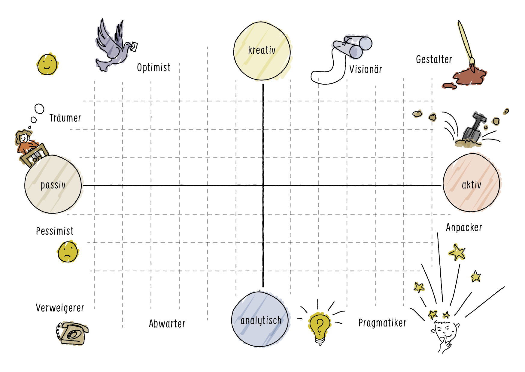 Die Befragung basierte auf unserem Buch „Zukunft 5.0: Handbuch für Zukunftsangelegenheiten“ und wurde von ACADEMIA SUPERIOR selbst entwickelt und in groben Zügen angelehnt an das DIGS-Persönlichkeitsmodell nach der Typologie von William Moulton Marston.