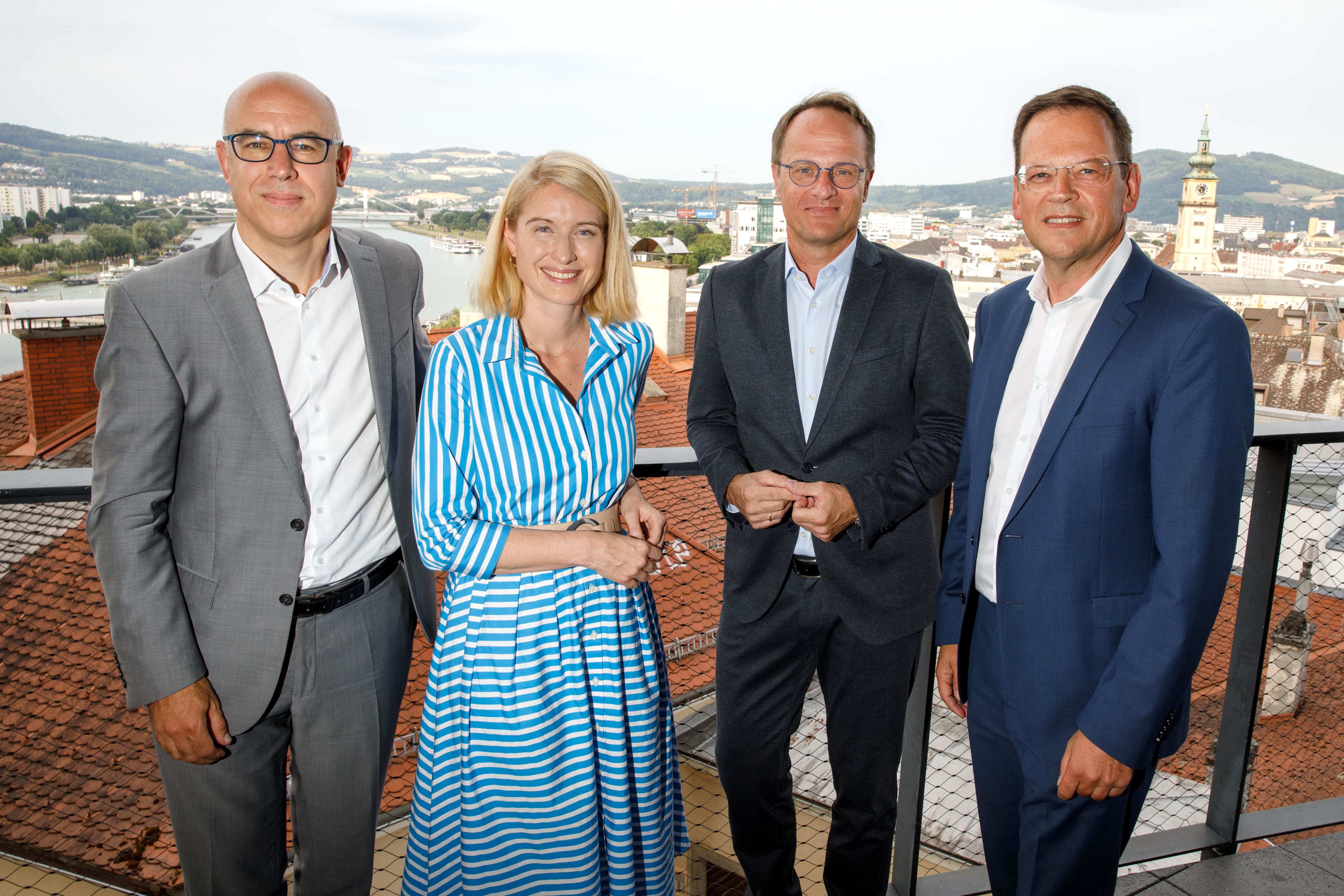 Foto 1+2: v.l.n.r.: Univ.-Prof. MMag. Gabriel Felbermayr, PhD, LH-Stellvertreterin Mag. Christine Haberlander, Univ.-Prof. Dr. Markus Hengstschläger und Hypo-Vorstandsvorsitzender Mag. Klaus Kumpfmüller
