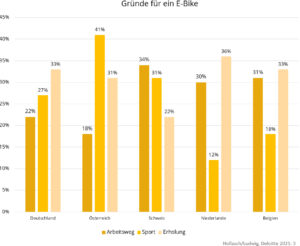Bei den angegebenen Gründen, sich ein Rad mit elektronischer Hilfe anzuschaffen, divergieren die Länder der DACH-Region und die Niederlande. Die Hauptargumente für den Kauf eines E‑Bikes sind zwar dieselben, in der Priorisierung unterscheiden sie sich jedoch voneinander. In Deutschland stehen Freizeit und Erholung an erster Stelle, in der Schweiz hat der Arbeitsweg große Bedeutung, während in Österreich das E‑Bike vor allem für sportliche Zwecke angeschafft wird. Dieses Argument ist in Belgien und den Niederlanden von äußerst geringer Bedeutung. (1)