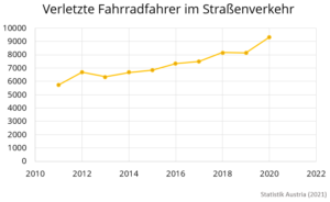 Für die jüngste Vergangenheit ist das wohl auch auf das veränderte Mobilitätsverhalten während der Lockdowns zurückzuführen. Betrachtet man jedoch die letzten 10 Jahre, zeigt sich eine Steigerung von knapp 40% an Verkehrsteilnehmer*innen, welche am Fahrrad verletzt wurden. Die Zahl der Todesopfer nimmt im Beobachtungszeitraum von 10 Jahren insgesamt ab, bei den Fahrradfahrern bleibt sie konstant.(6)