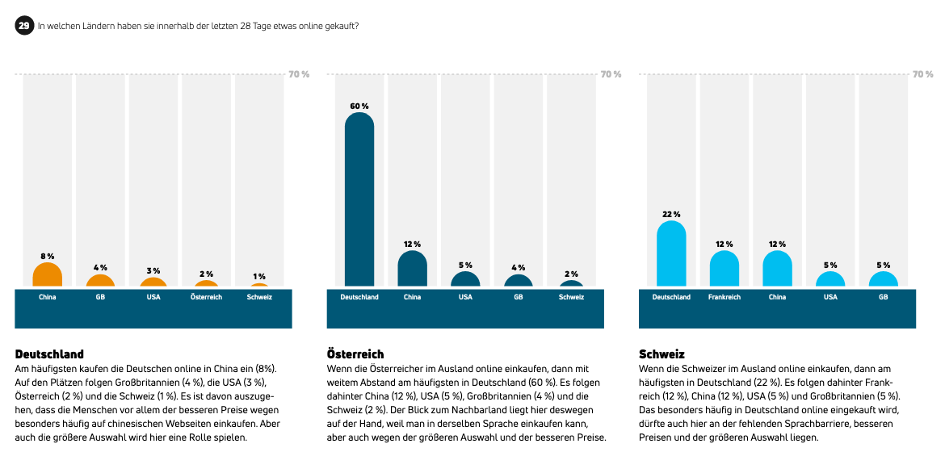 Heimis­che Unternehmen prof­i­tieren von dem Online-Boom nur bed­ingt, bestellen doch mehr als die Hälfte der öster­re­ichis­chen Online-Shopper*innen im Aus­land. Dabei ste­ht wenig über­raschend Deutsch­land als Einkauf­s­land an erster Stelle. (3)