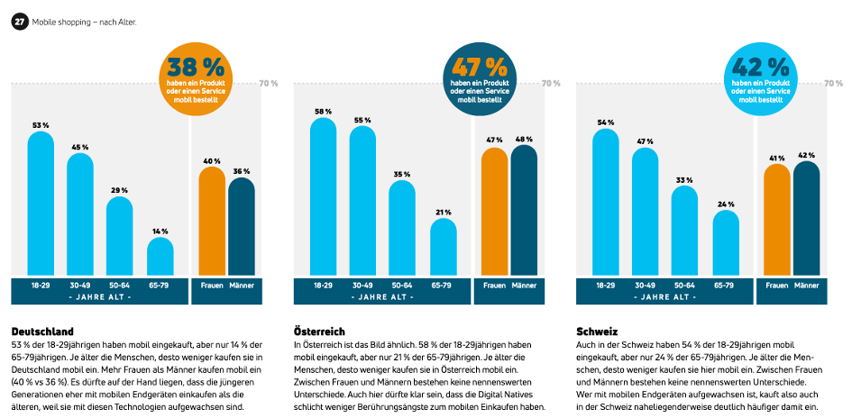 Im Nets E‑Com Report Dach 2020 (Befra­gungszeitraum 4. Quar­tal 2020) geben sog­ar 47% der Befragte an, schon ein­mal ein Pro­dukt oder eine Ser­viceleis­tung mobil bestellt zu haben. Auch hier ist der Alter­strend ein­deutig erkennbar. Im Ver­gle­ich zu den Nach­barn in der Schweiz und in Deutsch­land ist damit in Öster­re­ich das Mobile-Shop­ping (mit Mobil­tele­fon oder Tablet) im DACH-Raum am beliebtesten. (3)