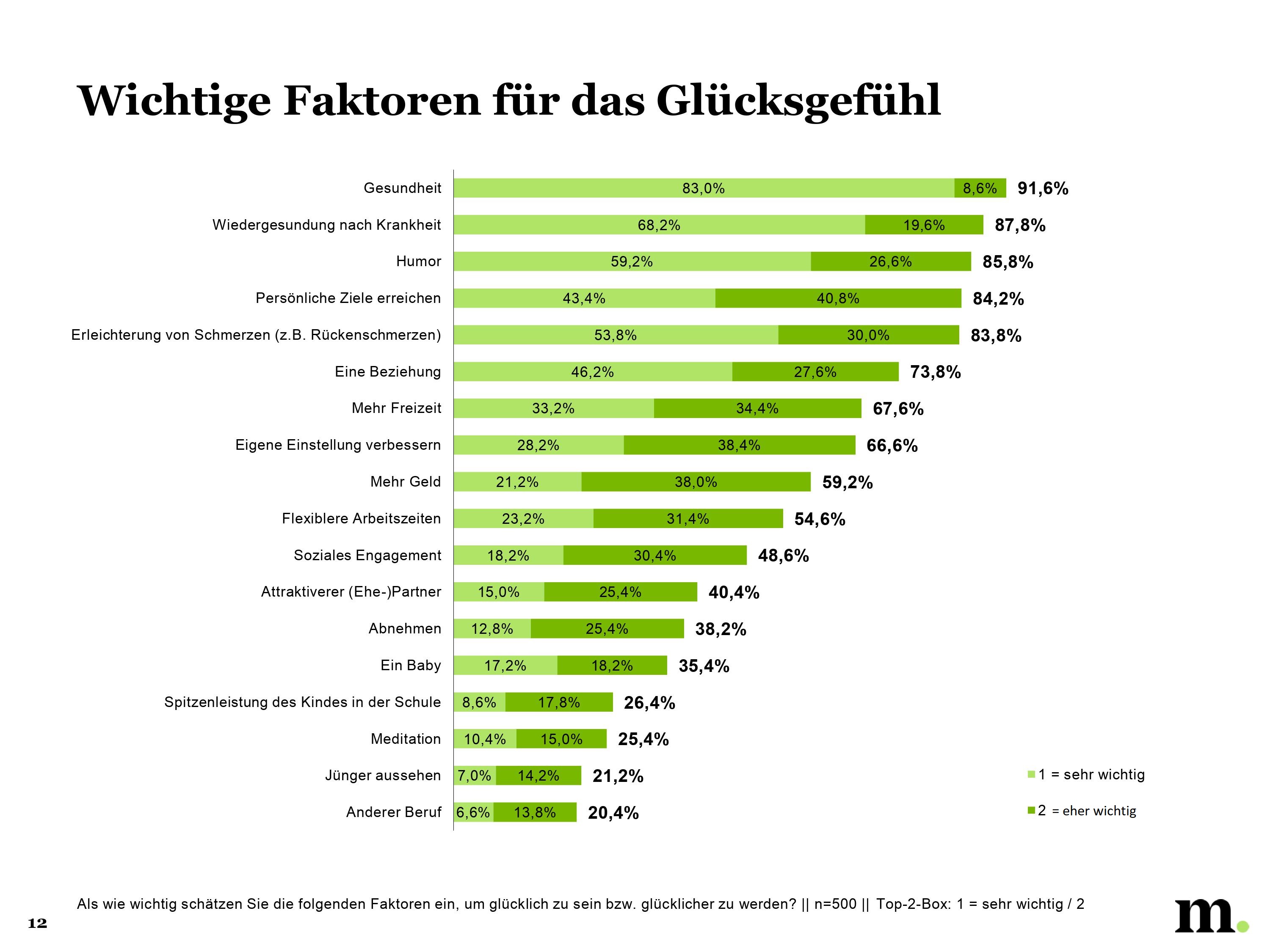 Auf die Frage, ob die angegebenen Faktoren wichtig für das Glücklichsein/-werden sind, gaben bei der Befragung im Februar 2022 in Österreich 91,6 % der Befragten an, dass Gesundheit ein sehr wichtiger oder wichtiger Faktor ist. 84,2 % wollen ihre persönlichen Ziele erreichen. Für 67,6 % ist mehr Freizeit wichtig oder sehr wichtig, während für 59,2 % mehr Geld sehr wichtig oder wichtig ist.