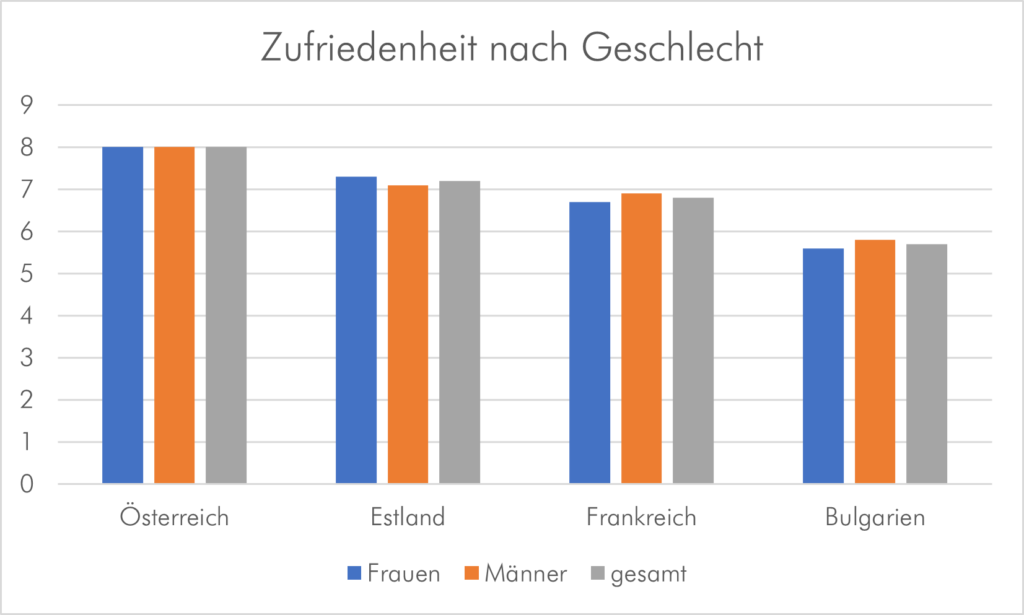 Die größten Unterschiede nach dem Geschlecht gibt es in Estland, Frankreich und Bulgarien. Während in Estland Frauen durchschnittlich 0,2 Punkte zufriedener sind als Männer, sind sie in Frankreich und Bulgarien um 0,2 Punkte unzufriedener.[6]