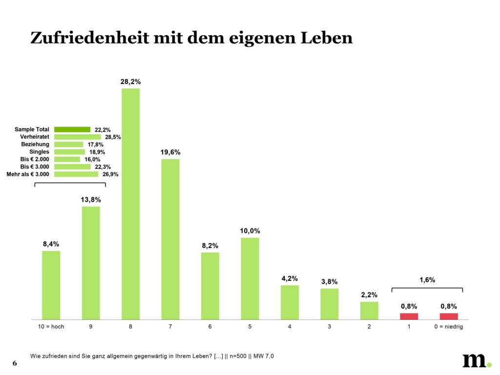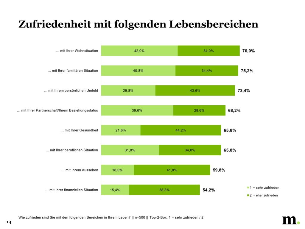 In der Marketagent-Befragung vom Februar 2022 waren mehr als die Hälfte der Teilnehmer:innen mit ihrer finanziellen Situation sehr zufrieden oder zufrieden. Mit dem Arbeitsplatz waren fast drei Viertel sehr zufrieden oder zufrieden. Und mehr als drei Viertel waren mit ihrer familiären Situation sehr zufrieden oder zufrieden. 73 % sind zufrieden oder sehr zufrieden mit ihrem persönlichen Umfeld.[4]