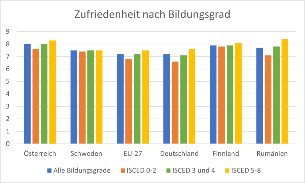 In der Gruppe mit dem geringsten Bildungsgrad sind die Finnen am zufriedensten (7,8) dahinter liegt Österreich auf Platz 2 (7,6). Beim mittleren Bildungsgrad liegt Österreich an der Spitze (8,0) und in der Gruppe mit dem höchsten Bildungsgrad wieder auf Platz 2 (8,3) hinter Rumänien (8,4).