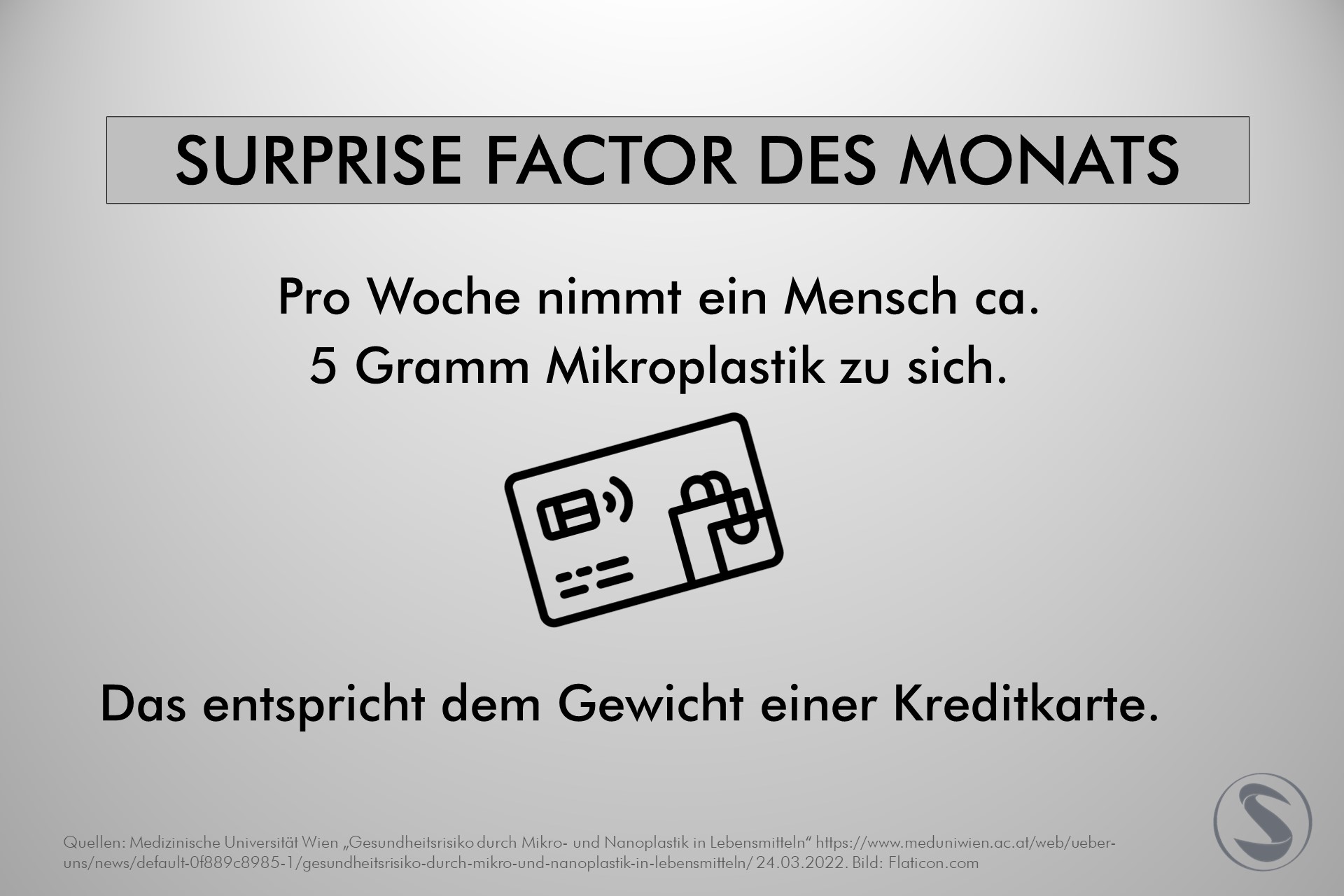 Laut einer Studie nimmt ein Mensch auf diesem Planeten im Schnitt pro Woche ca. 5 Gramm Mikroplastik zu sich. Das entspricht dem Gewicht einer Kreditkarte.[1]