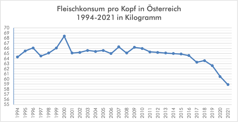 Zum ersten Mal seit Jahrzehnten ist der Fleischkonsum in Österreich im Jahr 2021 auf unter 60 kg pro Kopf gefallen. Der Verzehr von Fleisch durch Menschen — aber auch von Milch und Milchprodukten — geht in Österreich in den letzten Jahren teilweise stark zurück.