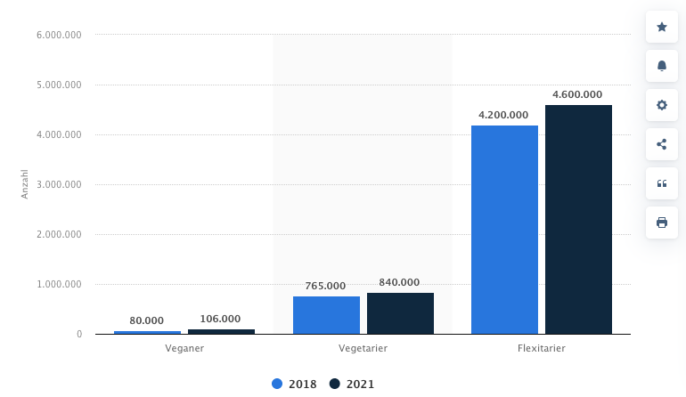 Quelle: Statista, Geschätzte Anzahl der Vegetarier, Veganer und Flexitarier in Österreich im Jahr 2021. Statista 2022. URL: https://de.statista.com/statistik/daten/studie/709815/umfrage/anzahl-der-vegetarier-veganer-und-flexitarier-in-oesterreich/