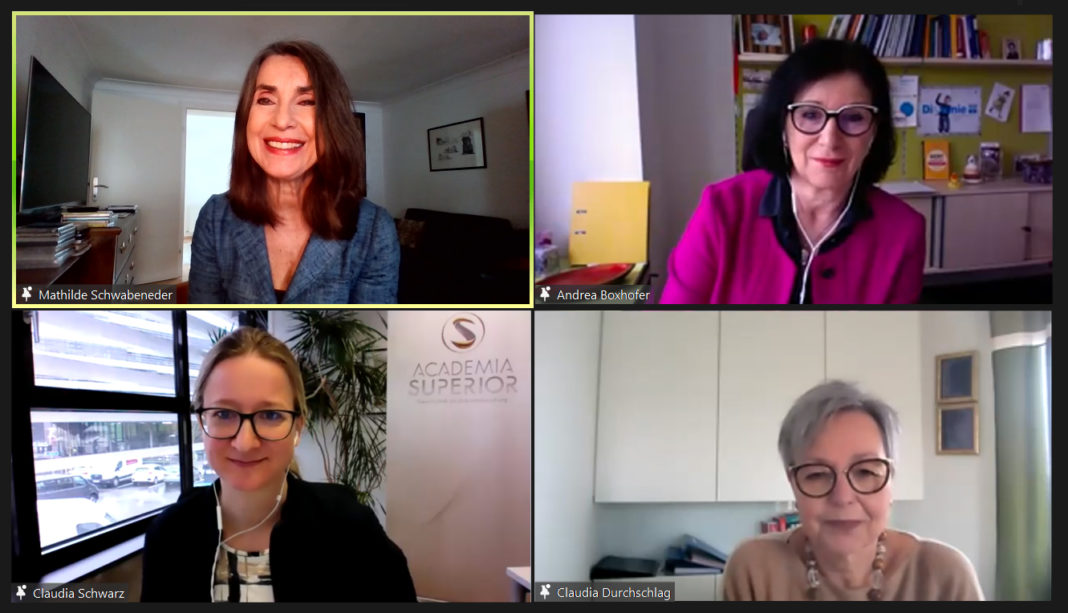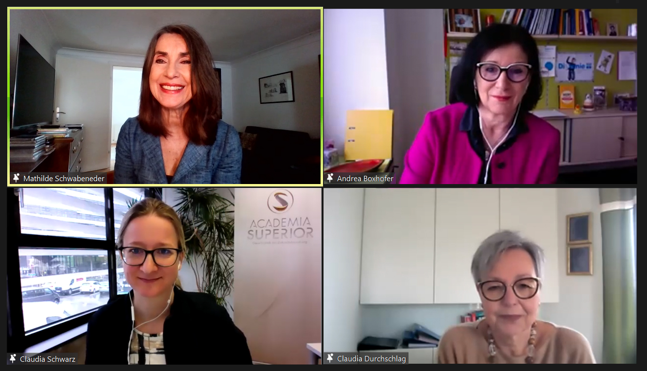 Welche Auswirkungen hat die Pandemie auf das soziale Gefüge? Und welche Rolle spielen dabei die Medien? Diese und weitere Fragen diskutierten ACADEMIA SUPERIOR und der Verein Frauen in Trend bei einem weiteren women4future RoundTABLE. Ziel der Kooperation ist es, mit mutigen Frauen aus Oberösterreich ins Gespräch zu kommen und damit andere zu ermutigen. Als Gesprächspartnerinnen waren Dr. Mathilde Schwabeneder, bis vor Kurzem Leiterin der ORF-Außenstelle in Rom, und die Geschäftsführerin des Diakonie Zentrums Spattstraße, Mag.(FH) Andrea Boxhofer, zu Gast.