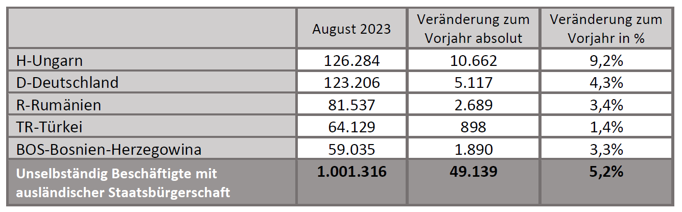 Nach­dem deutsche Staatsbürger:innen (vor allem aus Ost­deutsch­land stam­mend) jahre­lang die größte aus­ländis­che Beschäftigten­gruppe in Öster­re­ich waren, zeich­net sich langsam eine Trendwende ab. Über eine Mil­lion Men­schen mit aus­ländis­ch­er Staats­bürg­er­schaft waren ins­ge­samt in Öster­re­ich im August 2023 unselb­st­ständig erwerbstätig.