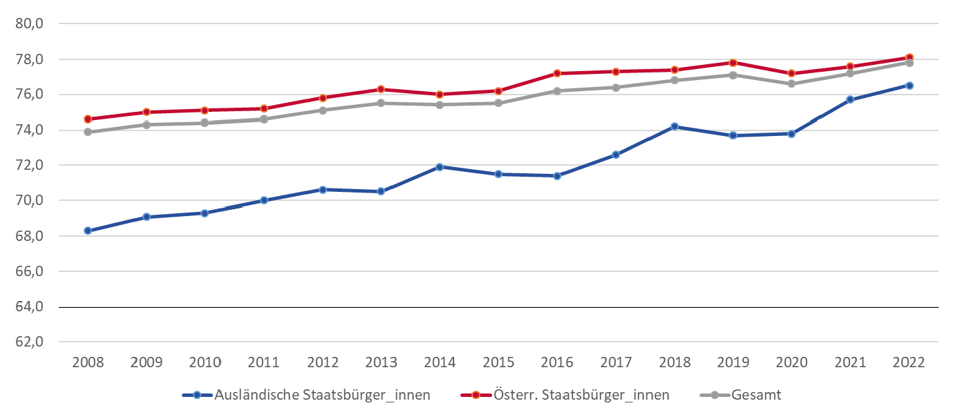 Auch bei den Erwerb­squoten zeigen sich deut­liche Verän­derun­gen (Abbil­dung 2): Die Erwerb­squote der 15- bis 64-Jähri­gen lag für öster­re­ichis­che Staatsbürger:innen im Jahres­durch­schnitt 2022 bei 78,1 % — um 3,5 Prozent­punk­te höher als im Jahr 2008. Im sel­ben Zeitraum ist die Erwerb­squote der Nicht-Österreicher:innen um 7,8 Prozent­punk­te – auf 76,5 % angestiegen. Somit hat sich die Erwerb­squote der aus­ländis­chen Staats­bürg­er inzwis­chen fast der der Österreicher:innen angeglichen.