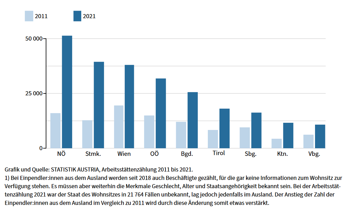 14 % der aus­ländis­chen Arbeitnehmer:innen pen­deln auch vom benach­barten Aus­land nach Öster­re­ich, das sind ca. 133.400 Men­schen. Davon pen­deln je rund 15 % nach Oberöster­re­ich und ins Bur­gen­land, 18 % in die Steier­mark und 20 % nach Niederösterreich.