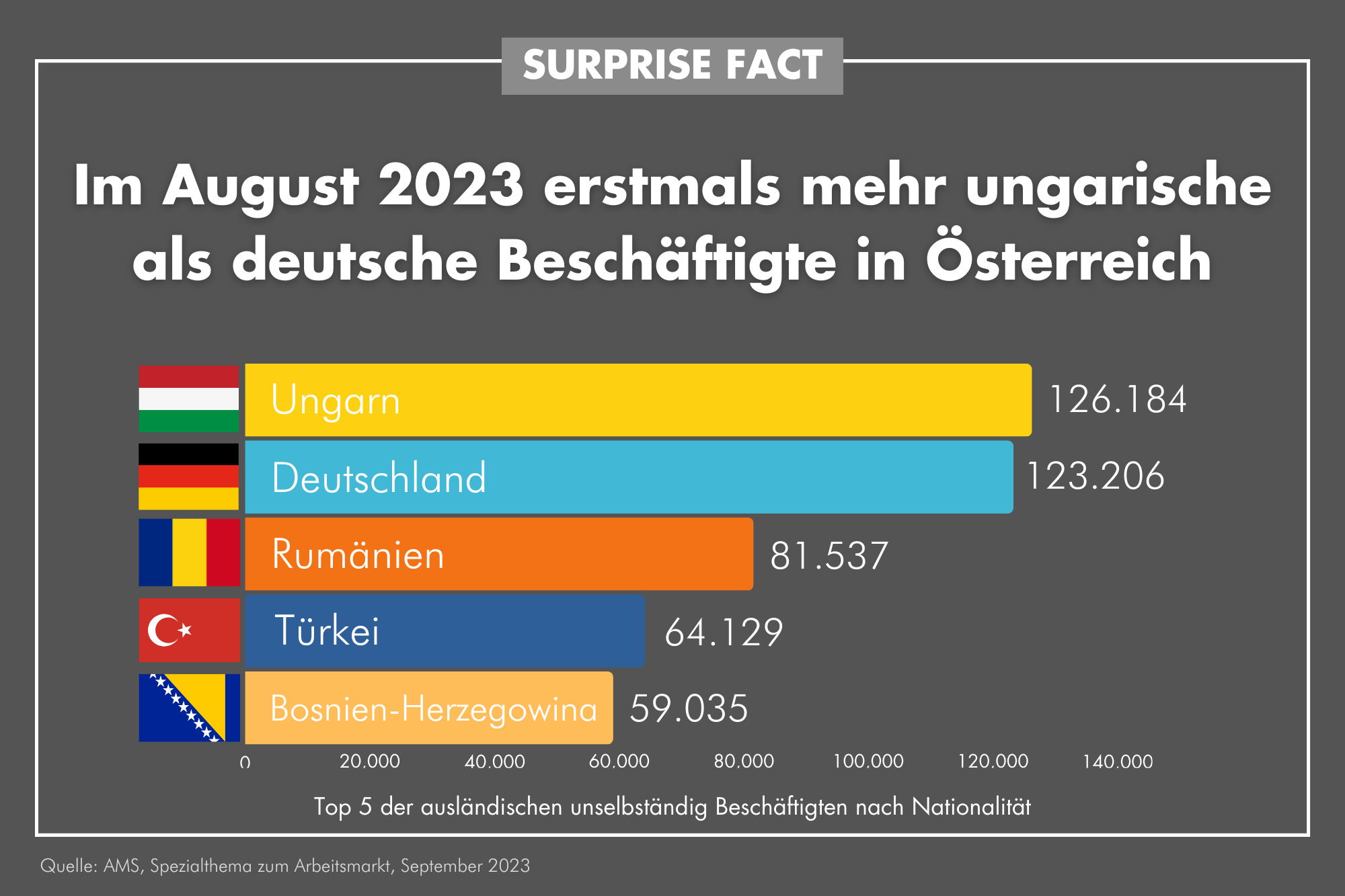 Im August 2023 waren erst­mals mehr ungarische Staatsbürger:innen als deutsche Staatsbürger:innen am öster­re­ichis­chen Arbeits­markt unselb­st­ständig beschäftigt.