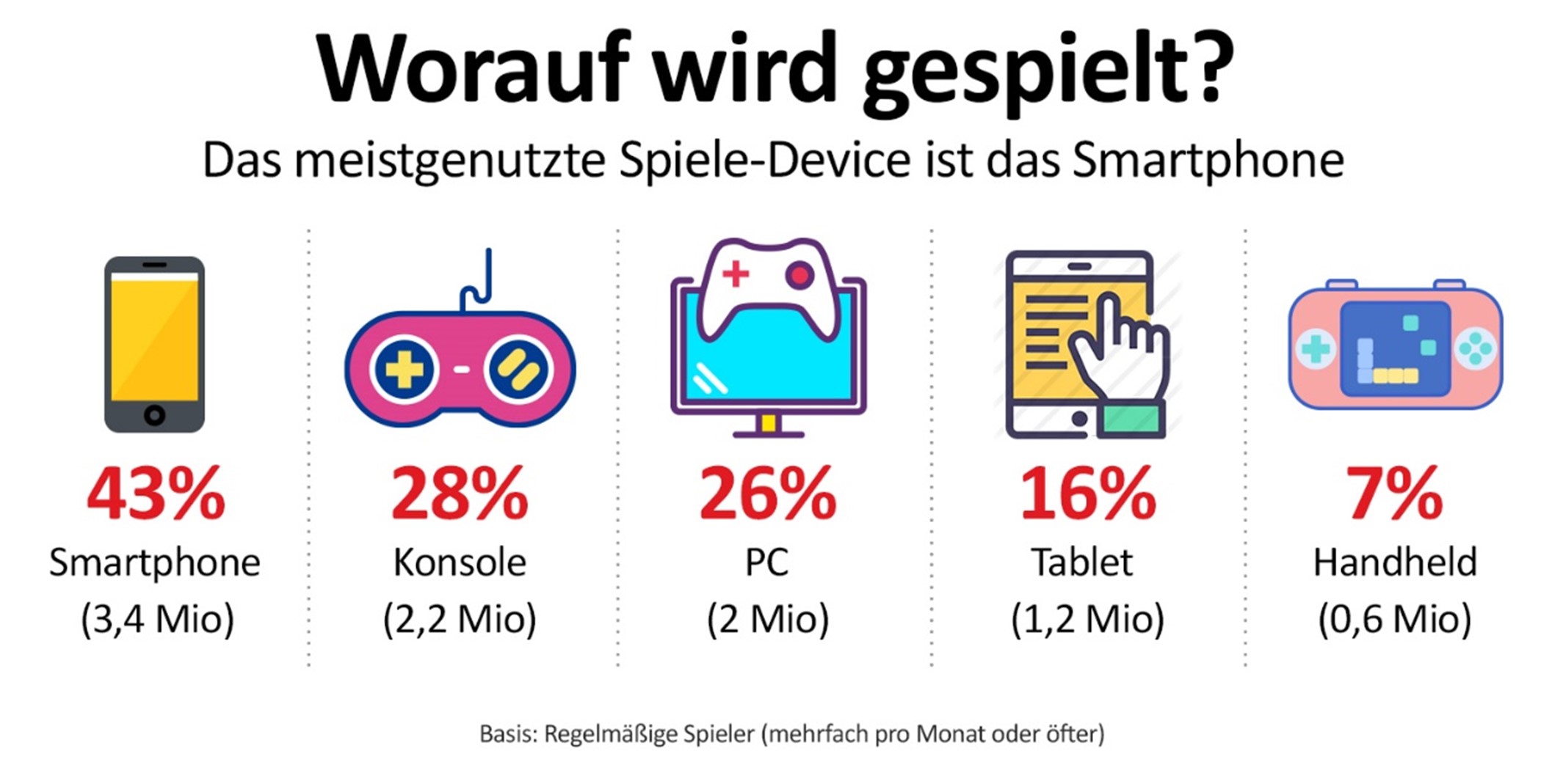 Am meis­ten wird auf Smart­phones gespielt (43 %), doch Spielekon­solen holen weit­er auf (28 %) auf Platz 3 liegt der PC (26 %).[4] Bis heute ist die meistverkaufte Spielekon­sole die PlaySta­tion 2[5], diese kam im Jahr 2000 auf den europäis­chen Markt.[6] Auf Platz 2 liegt der Nin­ten­do DS und somit eine trag­bare Kon­sole. Der Game­boy, der 1989 auf den europäis­chen Markt kam,[7] belegt bis heute den 4. Platz der meistverkauften Kon­solen.[8]