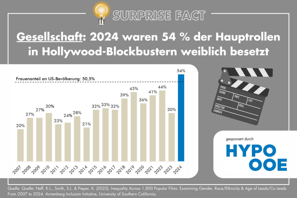 Erstmals in 18 Jahren wurde in den 100 umsatzstärksten Filmen eine Parität zwischen weiblichen und männlichen Hauptfiguren erreicht. 54 % der Filme aus dem Jahr 2024 hatten eine weibliche Haupt- oder Co-Hauptrolle – ein Höchstwert seit Beginn der Langzeitstudie (Neff, Smith & Pieper, 2025). Im Vergleich dazu lag der Anteil im Vorjahr bei nur 30 % und betrug im Ausgangsjahr der Untersuchung (2007) lediglich 20 %. Damit übersteigt der aktuelle Wert erstmals den demografischen Anteil von Frauen in der US-Bevölkerung (50,5 %) und könnte als Indikator für einen strukturellen Wandel in der Filmbranche gewertet werden.