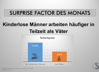 In Österreich arbeiten 6,8 % der Väter mit Kindern im Alter unter 15 Jahren in Teilzeit. Bei kinderlosen Männern ist dieser Wert mit 13 % fast doppelt so hoch.