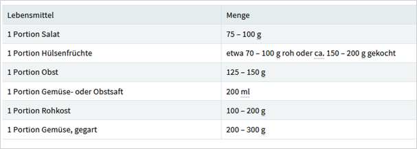 Für eine ausgewogenen Ernährung sollten täglich fünf Portionen Gemüse, Hülsenfrüchte und Obst gegessen werden, am besten drei Portionen Hülsenfrüchte und zwei Portionen Obst. [11] Eine Portion entspricht dabei etwa der Menge, die die jeweilige Person in eine Hand nehmen kann.