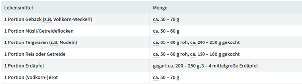 Von kohlenhydrathaltigen Lebensmitteln sollten täglich vier Portionen (von Sportler:innen und Kindern fünf Portionen) zu sich genommen werden.[12]
