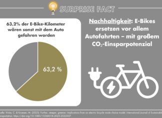 E-Bikes haben ein deutlich anderes Nutzungsprofil als herkömmliche Fahrräder. Modellrechnungen zeigen, dass 63,2 Prozent der mit E-Bikes zurückgelegten Kilometer ohne E-Bike mit dem Auto gefahren worden wären (43,1 Prozent aller E-Bike-Fahrten). Damit verlagern E-Bikes...